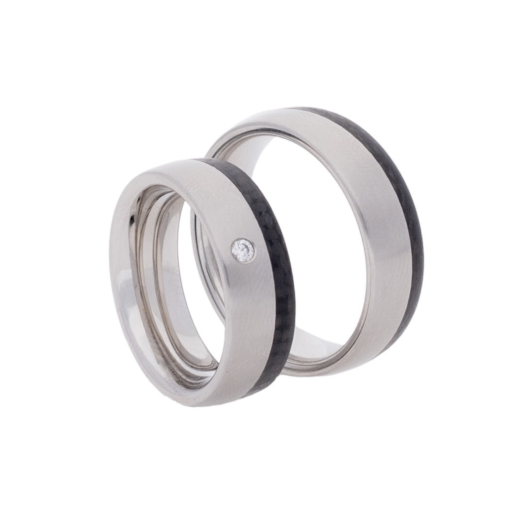 Trauringe aus Edelstahl und Carbon mit Zirkonia oder Brillant